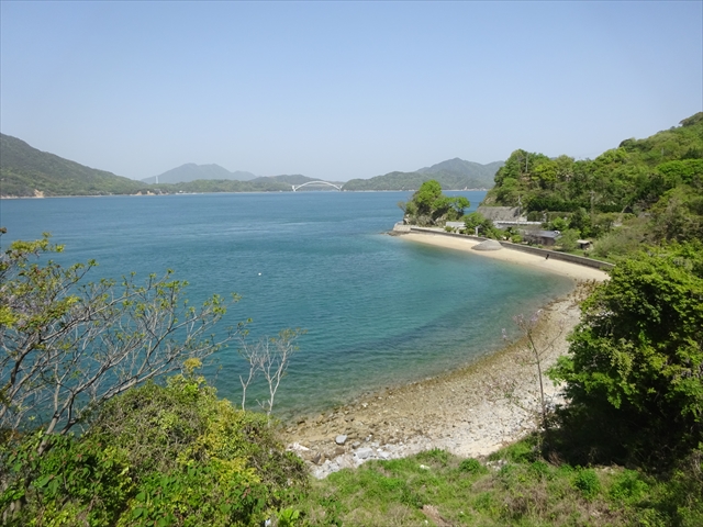 見えた風景、海水浴にはよさげな奇麗な海岸(潮の流れには注意) 遠くに大三島橋が見えます。