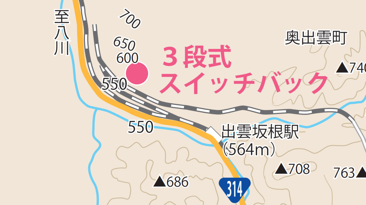 木次線 出雲坂根駅から先の三井野原駅間は標高差が162mと大きく列車はZ字を描くように三段式スイッチバックで登って行く。